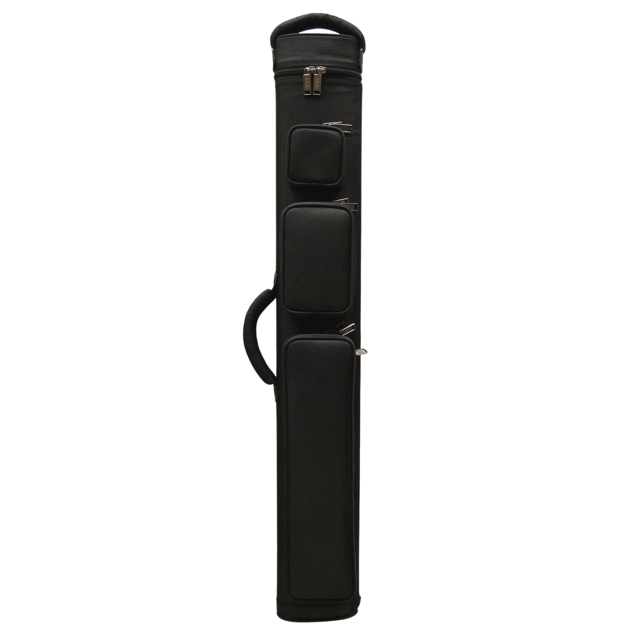 4 butts 8 shafts J&J case, nylon exterior, hold 4 butts 8 shafts, Thick satin dividers inside, with 3 pouches and jump cue pocket, top and side comfort handles, double shoulder straps with comfort shoulder pads. (if use one shoulder strap, may remove one to keep as spare). It is a strong and high quality case.