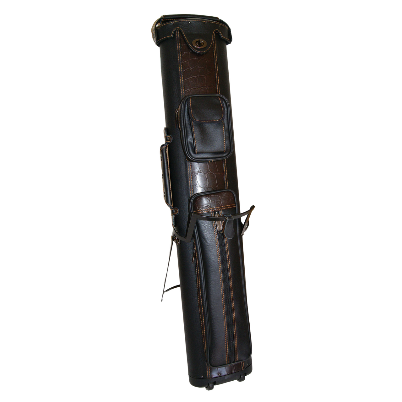 Hold 3 butts 5 shafts, spring loaded hard tubes, two pouches plus a jump cue pocket, two handles, and a comfortable shoulder strap.
