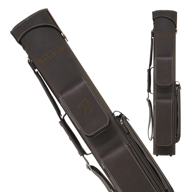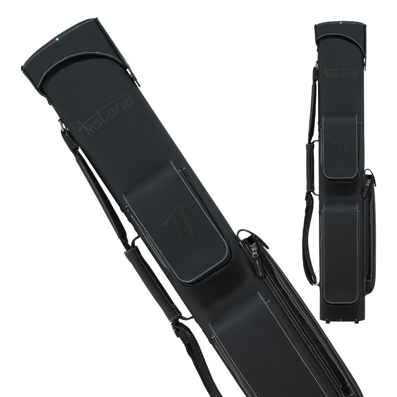 Every bit as beautiful and functional as its namesake, the Katana case is both masterfully crafted and roomy; perfect for the discerning pool hall samurai on the go. The exterior, though very simplistic in its design, is a smooth vinyl, etched with the Katana logo. Inside, each of the shaft and butt sleeves are lined with black felt, ensuring that your cues will emerge unscathed, no matter how rough the trail may be. This case is built to hold two butts and four shafts up to 32″ in length. In addition, there are three spacious pockets–two magnetically sealed pockets on the front with side zippers and one zippered extension/jump pocket on the side. For your comfort, the case has both a buttoned side handle as well as a lengthy shoulder strap, both made with the same finely tooled black leather as the case itself.