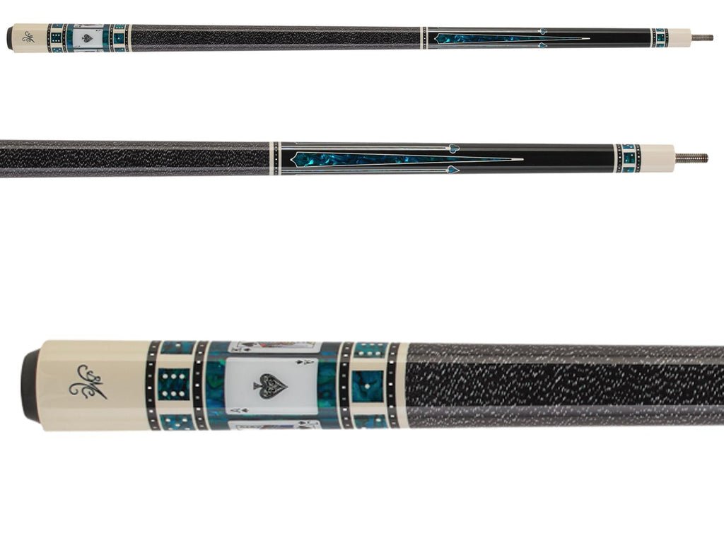 The Meucci Casino Series are some of the most sought after cues on the market. The Casino 3 features black with cream outlined blue Paua shell floating inlays and alternating cream and blue Paua shell inlays ending with suite of cards. This cue has a