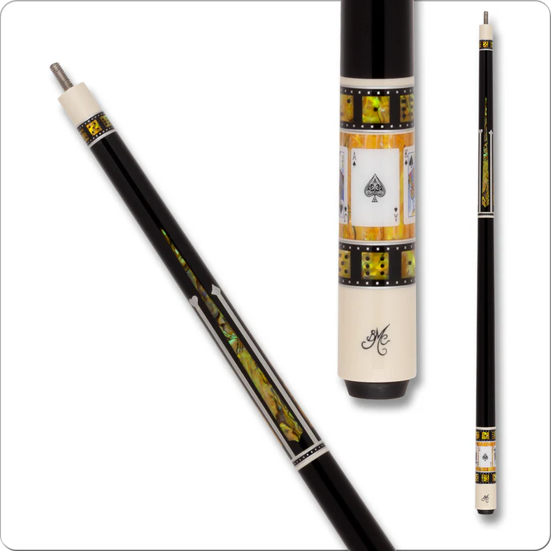 The Meucci Casino Series are must-haves for serious players. The Casino 8 serves up a sumptuous Las Vegas vibe, with Gold Paua Shell sleeve, 4-Card Royal Flush bordered by Gold Paua shell Casino dice, set in black, all on a Lacquered Black linen handle. And the added ultra-luxury? The 12.5mm Pro Shaft complete with Ultra Skin Medium tip. A winning combo.