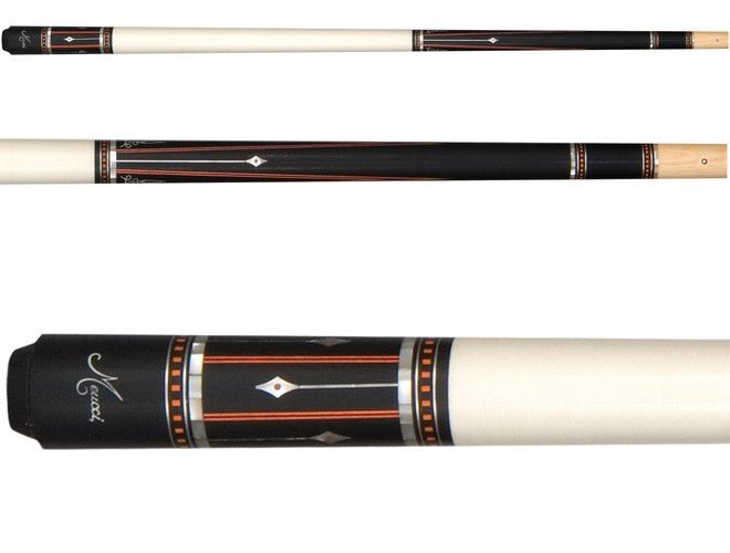 The Meucci Model 2102 is a beautiful cue. Meucci designs are some of the most interesting and unique cues made today. The Ebony with contrasting red veneers once again makes a great looking cue. The wrap is a lacquered White Irish Linen for a wrap less feel.