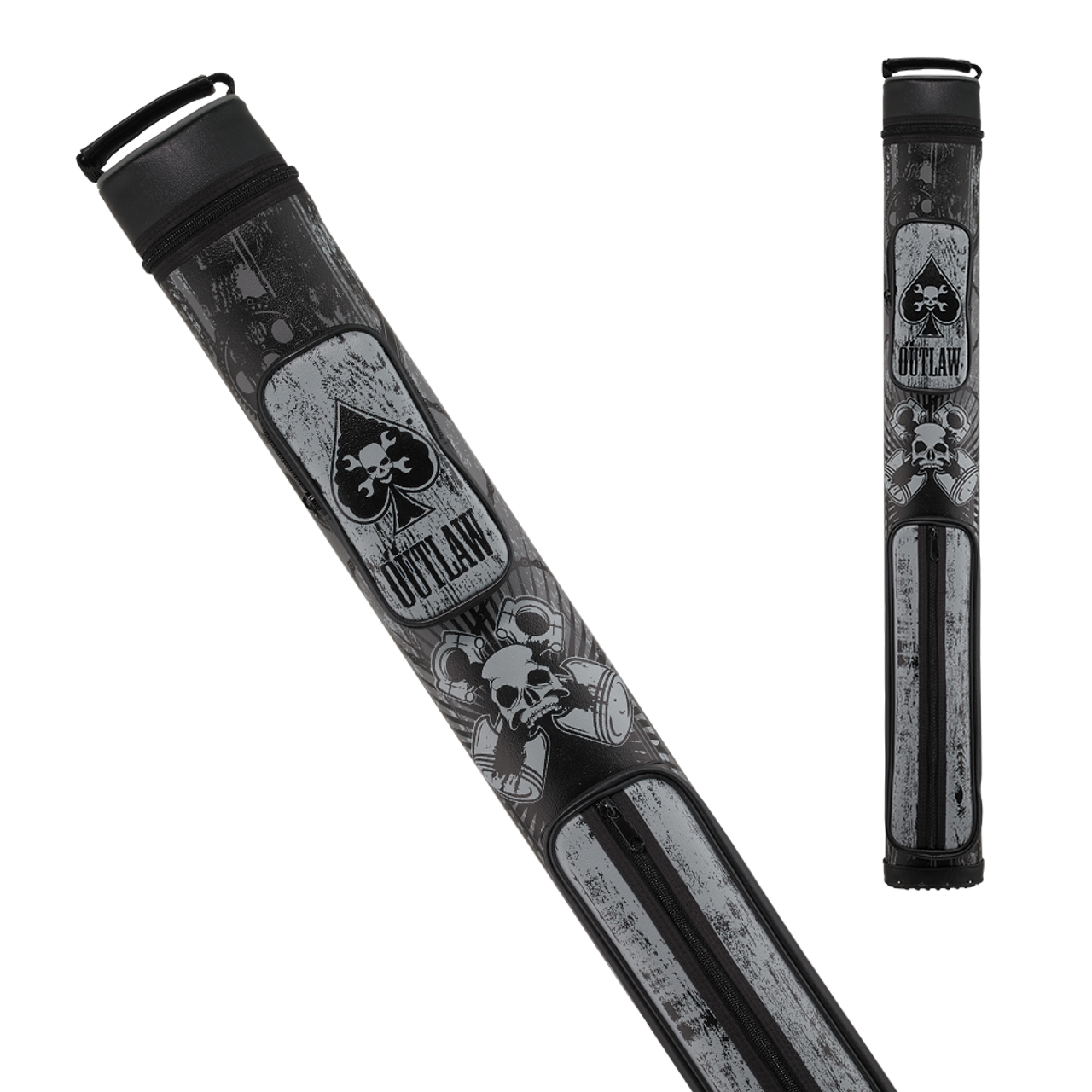 The Outlaw OLB22H 2 butts & 2 shafts hard case has a poured rubber mold with felt lining to help keep your shaft and butt secure and protected. The graphics on this 2×2 hard case show off the black and grey skull with pistons and spark plugs. The case has a small accesory pocket with a skull and 2 wrenches encased by the Outlaw spade logo. The longer accessory pocket, 3 ½” x 14” long to be exact, will house more accessories. This case can be carried by either the strudy handle at the top of the case or flung over you shoulder with adjustable strap on the back of the case.