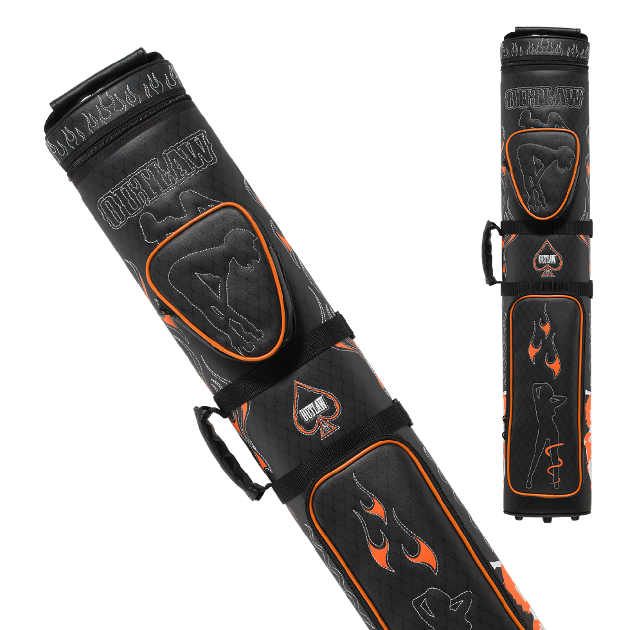 Pool can be a heated game from time to time and Outlaw knows that better than anyone! With that in mind, we have a new smokin’ hot case from Outlaw, embroidered over with vivid orange flames, spades, serpents, and some lovely ladies to boot! The case itself is extremely sturdy, utilizing heavy duty vinyl throughout the exterior and poured molds for the interior. The case will hold 3 butts and 5 shafts and includes two generous pockets to hold all your accessories.